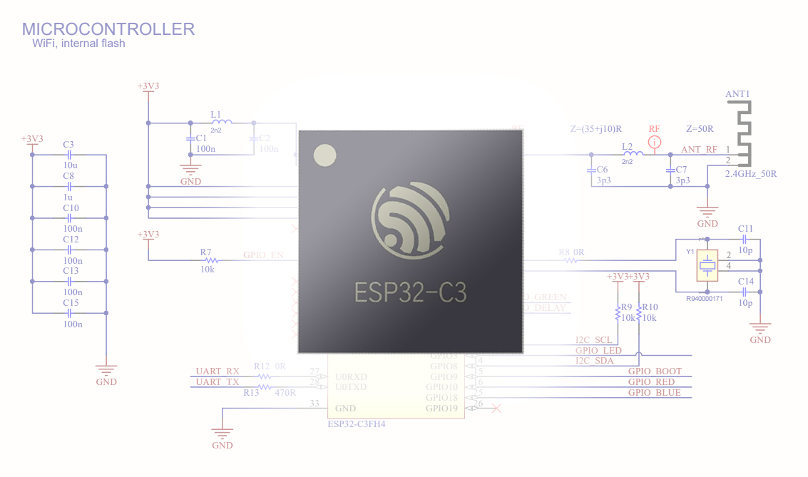 For this project, an ESP32-C3 microcontroller was selected because mainly for its WiFi capability. Also the microcontroller with internal flash was selected in order to save space on PCB.